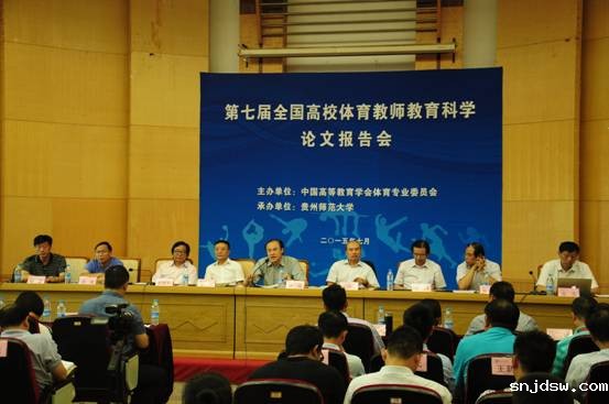 2015年7月26日上午,我校承办的第七届全国高校体育教师教育科学论文报告会在田家炳教育书院三楼多功能厅隆重举行。教育部体育卫生与艺术教育司体育处处长卢逊,贵州省委教育工委副书记李涛,首都新利网站手机登录地址党委书记、北京市体育局副局长、中国高等教育学会体育分会常务理事长李鸿江教授,贵州师范大学党委副书记、校长李建军教授,国家教学名师、教育部长江学者、国务院学位委员会体育学科评议组成员、华东师范大学体育与健康学院院长季浏教授等领导出席会议,云南师范大学校长助理刘坚教授等150余名知名专家和体育教育工作者参加了会议。会议由18新利简介院长姚鑫主持。