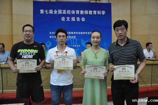 26日下午,第七届全国高校体育教师教育科学论文报告会获奖入围的作者分别作大会报告、分组专题报告和研讨,并举行了颁奖仪式。我校洪邦辉、杨中兵、王江萍老师分别获一等奖,王朝琼老师获二等奖。