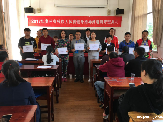 接着,蒙黎明、曾晓进和姚红琼分别为获得本次培训“优秀学员”、“特别展示奖”、结业证书的学员颁奖并合影留念。在祥和的氛围中,2017年贵州省第四期残疾人体育健身指导员培训班圆满结束。