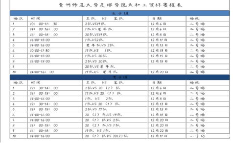 2020年12月6日,足球学院“天河工贸杯”足球比赛正式开赛。各参赛队员满腔热血,奔跑在球场上,挥洒着青春热血。本次比赛共有9支队伍参赛,历时14天,共20场比赛!敬请期待!