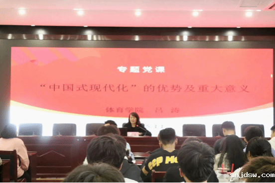 吕涛以《中国式现代化的优势及重大意义》为题,从党的二十大报告内容引入中国式现代化这个主题,并从人口规模巨大的现代化、全体人民共同富裕的现代化、物质文明和精神文明相协调的现代化、人与自然和谐共生的现代化、走和平发展道路的现代化等方面阐释中国式现代化的特征。随后,吕涛老师详细解读了中国式现代化的八大优势和三个重大意义。同时,对团学干部如何把自己锻造成坚定的“青年马克思主义者”再次提出了要求。