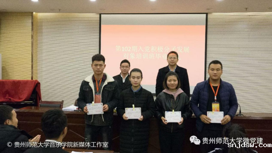 11月6日晚上7:00,贵州师范大学第102期入党积极分子发展对象培训班(简称“党训班”)宝山校区结业典礼在音乐大楼9-4成功举行。我院选派的26名学员圆满完成各项培训任务,全部通过了结业考试,顺利结业,实现了多年来我院上10人以上规模过关率达到100%的历史性突破,其中严锋、甘定龙、毕昌怡三位学员被评为“优秀学员”,杨馥瑞老师被评为“优秀指导老师”(全校共评出3位优秀指导老师,其中宝山校区1名、花溪校区2名)。