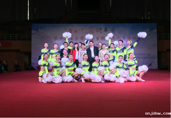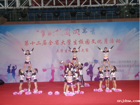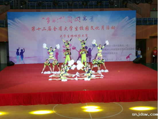 为加强和改进大学生思想政治教育工作,展现当代大学生健康向上的精神面貌和青春风采。10月28日下午,由省教育厅、省文明委和团省委主办的“多彩校园,闪亮青春”第十二届全省大学生校园文化月活动大学生啦啦操大赛在贵阳学院举行。教育厅赵廷昌等领导出席,我校参赛队由新利网站手机登录地址组织选拔18名队员参加决赛,院党委副书记吕涛、团委书记彭佐扬及教练李政、宋方芳、赵贡美等老师带队。
