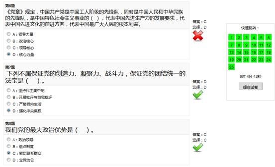 在进行试卷竞赛的时候,选择好后,右边的导航会标记为绿色。用鼠标点击相应的题号,可以快速到达此题。