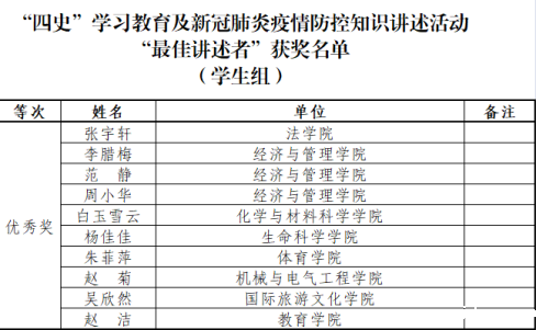 新利网站手机登录地址组织师生参加了学校开展的“四史”学习教育及新冠肺炎疫情防控知识讲述活动,在本次活动中,我院教师朱江荣获教师组“最佳讲述者”三等奖,20级武术与民族传统体育班朱菲萍荣获学生组“最佳讲述者”优秀奖。