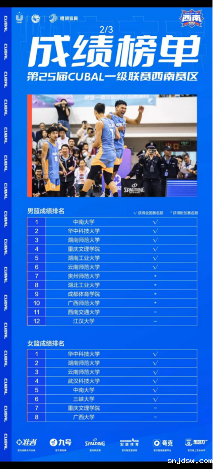 3月26日,第25届CUBAL联赛西南赛区在云南财经大学圆满落下帷幕。我校男篮八进四阶段加时赛2分惜败上届全国八强重庆文理学院后,排位赛以91:83战胜湖北工业大学,最终获第七名和体育道德风尚奖运动队,球员付泳畅获赛区得分王、单场得分王称号。