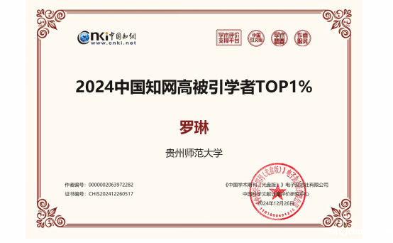 近日,由中国知网中国科学文献计量评价研究中心(简称“知网评价中心”)主办的“2024年中国知网高被引学者”研制报告发布会在北京举行。会上正式发布了《“2024年中国知网高被引学者”研制报告》,并公布了入选名单。经过客观、严谨的评价程序,我院罗琳教授成功进入“2024中国知网高被引学者TOP 1%”行列。